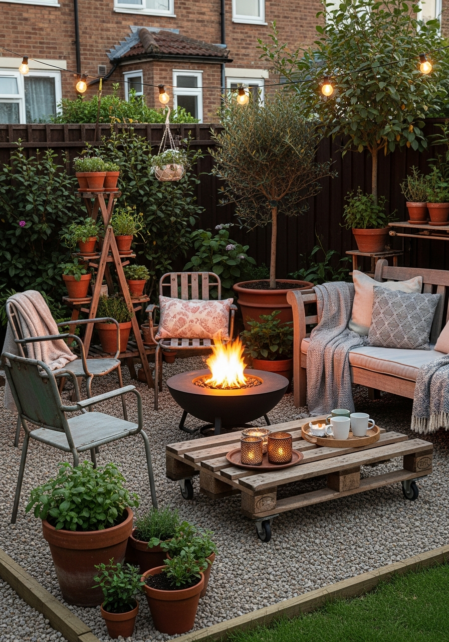 A fire pit can become the focal point of a small patio garden, creating warmth and atmosphere without high costs.